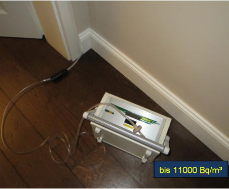Radon-Quellensuche (Radon-Sniffing)Bei der Radon-Quellensuche geht es um eine Erkennung der wichtigen konvektiven Radon-Eintrittsstellen und deren Lokalisierung. Nur nach einer gründlichen Untersuchung können die richtigen Maßnahmen getroffen werden. Im Zuge einer Sanierungsplanung können auffällige Eintrittsstellen erkannt und abgedichtet werden.Auch die Aktivitätskonzentrationen an den Radon-Eintrittsstellen schwanken im zeitlichen Verlauf stark - noch stärker als die Raumluftkonzentrationen. Die beim Radon-Sniffing vorgefundenen Aktivitätskonzentrationen können im Bereich der Bodengaskonzentrationen im höheren kBq-Bereich liegen.Aus diesem Grund sollte bei der Messung vor Ort eine ausreichende Druckdifferenz (Unterdruck auf der Raumseite) gegenüber der Bodenluft unter dem Gebäude vorherrschen. Dies gelingt im Winter oft durch den natürlichen thermischen Auftrieb während der Heizperiode. Durch eine gezielte ventilatorgesteuerte Unterdruckhaltung z.B. nach dem Blower-Door-Prinzip kann ein Unterdruck auch außerhalb der Heizperiode hergestellt werden. In üblichen Einfamilienhäusern genügen schon 10 bis 20 Pascal Unterdruck aus. Aus diesem Grund können Messungen zur Radon-Quellensuche auch gut in Verbindung mit dem Rn50-Test während der Wartezeit bis zur Ausgleichskonzentration in der Raumluft durchgeführt werden.=> siehe Radon-Check Rn50-Test und Quellensuche
